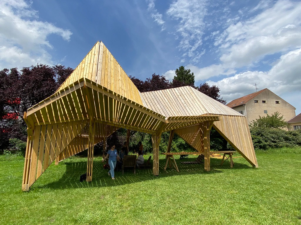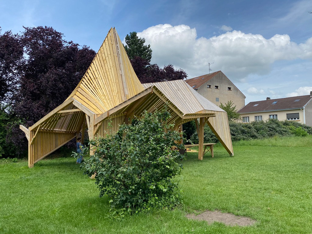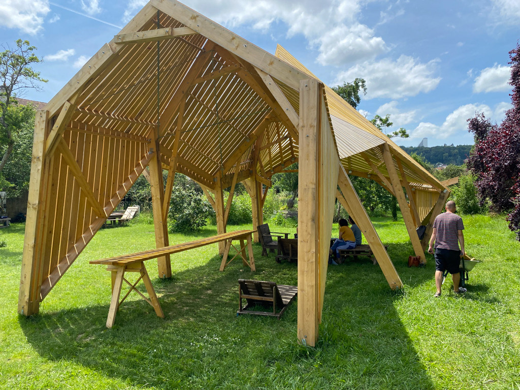 Structure Païenne portant ombre et accueillant les jardiniers du jardin partagé des 3 maisons. Improvisation structurelle dans champ libre